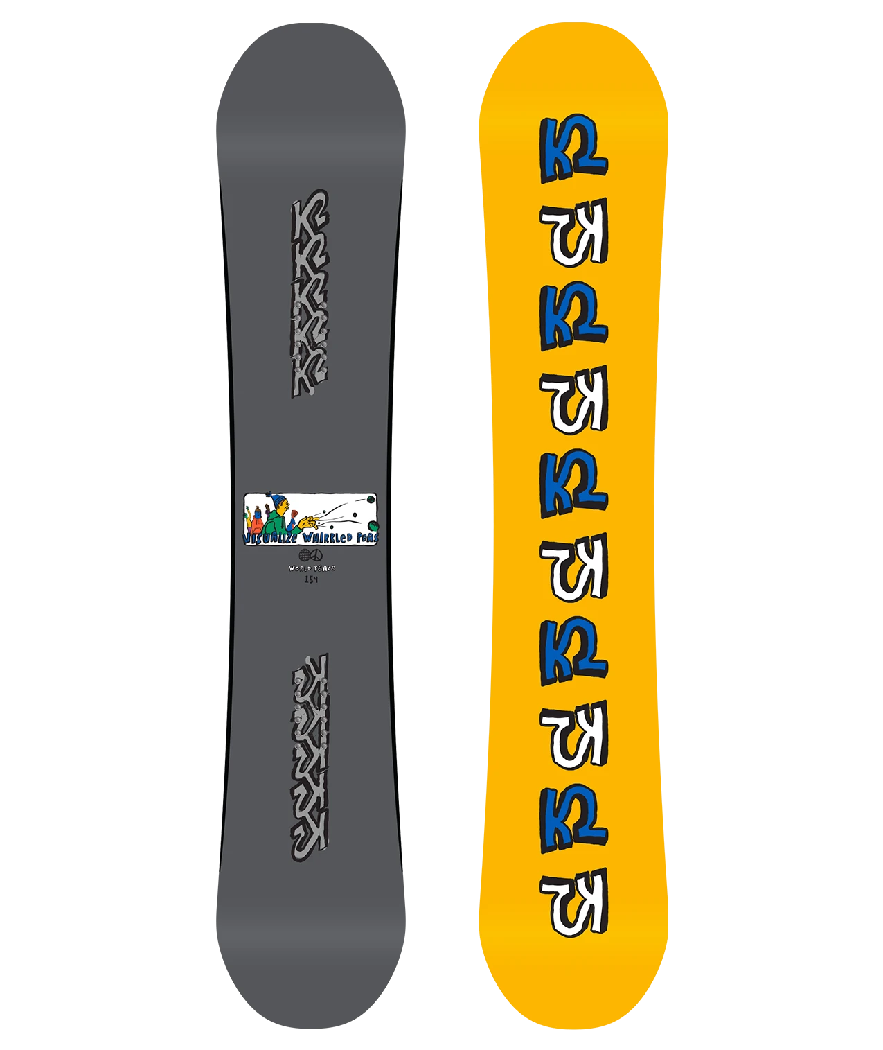 De K2 World Peace Wide is een echte twin voor het betere freestylewerk. Het is de opvolger van de K2 Secret Weapon. Het is uitgevoerd met een camber van voet tot voet en lichte rockers in de tip en tail. Hierdoor is alles wat te maken heeft met butteren en jibben heel easy. De lichte houten kern met 2-laags glasvezel helpt hier ook nog een handje mee. Het geeft een softe flex in zowel lengte als breedte, de torsie zeg maar. De base is een sintered variant, die dus heel goed glijdt en ook nog eens goede weerstand bied tegen alle schade die de obstakels in het park op je board achter kunnen laten. De eenvoudige maar stijlvolle print maakt dit board af.