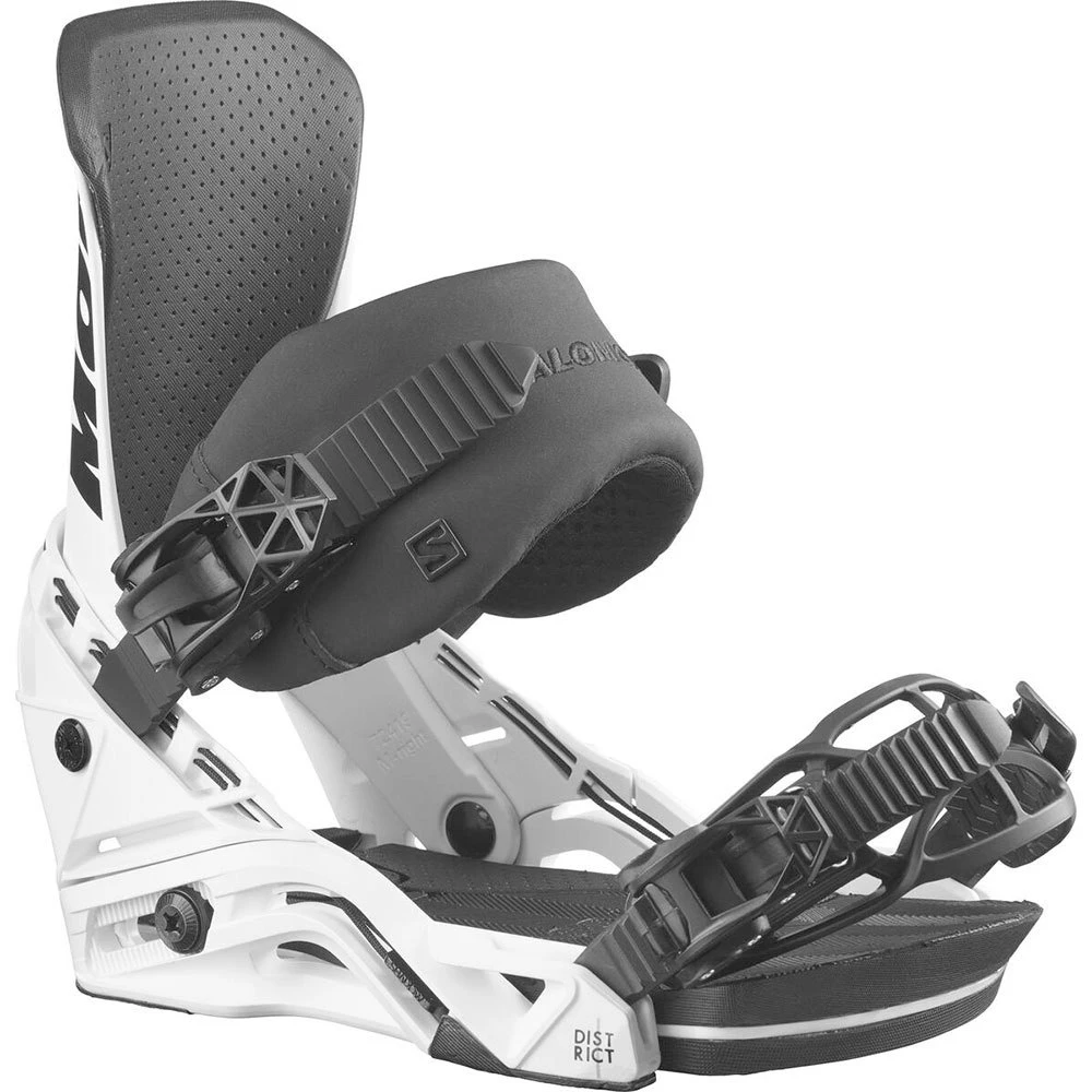 De Salomon District is een all-mountain-freestyle georiënteerde binding met een zachte tot medium flex. De heelcup van de baseplate is gemaakt van flexibel materiaal en verstevigd met een kevlar draad die helemaal tot de baseplate loopt. Het mooie hieraan is dat de binding als 1 geheel mee beweegt met je benen. Een gebalanceerde flex die natuurlijk aanvoelt, perfect voor het freestylen. De baseplate is voorzien van genoeg EVA foam wat voor een comfortabele rit zorgt. Daarnaast is het voetbed gekanteld wat voor een natuurlijke houding op je board zorgt. je kan hem in lengte uitschuiven zodat deze goed matcht met de lengte van je schoen. De straps gaan super soepel en bieden lekker veel comfort. Dit komt door de minimalistische uitvoering. geen stiksels en stofjes, die toch alleen maar kapot gaan. Deze straps vormen volledig naar je boot. Ook is deze binding best licht van gewicht.